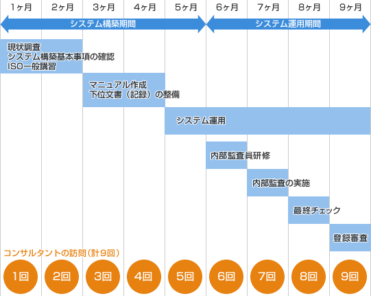 ISO認証取得までの一般的なスケジュールをご紹介いたします。実際には、企業様のご希望をお聞きし、最適なスケジュールをご提案させて頂きます。